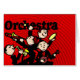 Arrière - plan rouge avec les contours noirs minces des cercles concentriques derrière un groupe du jeu et du mot "orchestre" de musiciens en haut.