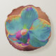 Orchideeënschildering in blauwgroen, paarse, roze en blauw verfraait dit kussen. In kleuren van paarse, turkoois, sinaasappel, blauw, amber en natuurlijk.