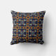 Un coussin décoratif audacieux présentant un motif ornemental géométrique original dans des tons de marine, rouille, crème et sauge pâle.