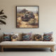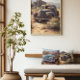 Schilderij van een oude blauwe verlaten auto in de woestijn
