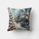 Kerstkussen. Ja. Ouderwetse retro trein in een prachtige besneeuwde winterscène met een dennenboom met verlichte kerstverlichting.