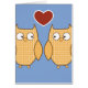 Ideaal voor kinderen - ontwerp van twee uilen die samen staan met een rood liefdeshart tussen hen op een hemelblauwe achtergrond. Kute en eigenzinnige cartoon ontwerpen geïnspireerd door liefde en vriendschap.