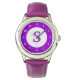Het Paarse horloge van het kind met klein douane monogram pictogram. Pas de moderne doopvontbrief van het initiaal in het witte embleem aan om tot het een uniek cadeau te maken. Oorspronkelijk cadeauidee voor de geboorte van het meisje en andere gelegenheden. Kleurig helder ontwerp met aanpasbare achtergrondkleur.