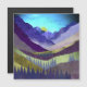 Een abstract landschap met unieke texturen die een paarse en lavendelberglandschap tonen met een prachtige blauwe lucht en een zwerm vogels in de kleuren paarse, lavendel, beige, geel en roze.