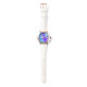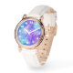 Een horloge met een kosmische abstracte achtergrond. Draaiende levendige kleuren van lichtblauw, roze en paarse. Witte sterren verspreid rond.