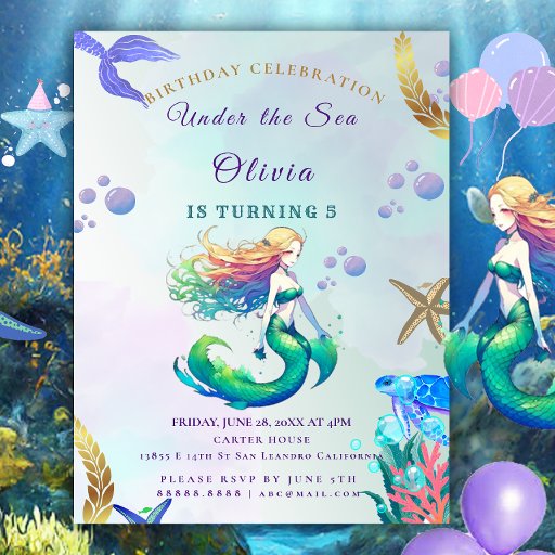 Paarse Zeemeermin onder het Zee met zee Creatures. "Doe mee aan de onderwaterviering met deze betoverende paarse en gouden zeemeermin verjaardagsuitnodiging. Een prachtige zeemeerminstaart en een grillige zee scene, waardoor het een perfecte pasvorm is voor elke kleine zeemeermin's speciale dag.