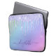 Aangepaste kleine iPad-cover met dunne, paarse glitter die naar beneden druipt in een pastelroze, paarse, blauwe en groene regenboogachtergrond. Personaliseer met uw voornaam in een stijlvol trendy paars manuscript met swashes.