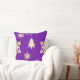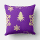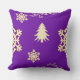 Een kleurrijk kerst paarse gooi kussen, met sneeuwvlokken, kerstbomen en wervelingen verspreid over een feestelijke paarse achtergrond.