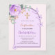 Een blush roze achtergrond met een boog. Versierd met een paarse, violette bloemen, rozen bloem, groen waterkleurig eucalyptusgroen en vlinders. Personaliseer en voeg een naam en details toe. Rug: blush roze achtergrond kleur. 1 vel = 1 uitnodiging afgedrukt rand tot rand.