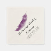 Trouwservetten met een op waterverf geïnspireerde afbeelding van een paarse veer. Personaliseer de tekst met namen en datum.