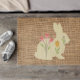 Doormat met het lichtgekleurde silhouet van een paasbunny met lentbloemen op de achtergrond van de schoot. Geweldig thuis voor een rustige lente decor. Ontwerp door Alma Wad.