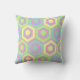 Deze werpkussen hebben een geometrisch ontwerp van zeshoeken in bleek blauw, bleek geel en bleek groen op een gebied van strepen in bleek roze en bleek paars.