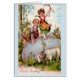Een paaskaartje afbeelding toont een bos-landscène met twee kinderen die spelen en lachen boven op een groot gekleurd paasei. Een lamsvlees grijpt naast hen met een florale kreet rond zijn nek. De jongen houdt een mand bloemen vast, terwijl het meisje een bloemen tak in haar hand in de lucht steekt. De voorkant van de kaart zegt "Pasen groeten" en de boodschap is: "Vrolijk Pasen, Happy Spring, Happy, gelukkig alles!"