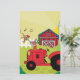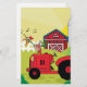 Schuif plakboekpagina's die voorzien zijn van een rooster op een tractor in een landveld met een grote rode schuur op de achtergrond.