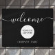 Logo d'entreprise personnalisé et porte de nom élégante avec le nom de votre entreprise défini dans un texte blanc classique sur un arrière - plan noir avec le message "bienvenue" qui est défini dans un élégant texte de script blanc. Personnalisez avec vos détails et customisez la couleur à la couleur de votre choix. Conçu par Thisisnotme©