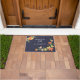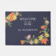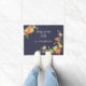 Une frontière faisante le coin lumineuse de jaune, d'orange, et pâlissent - les hémérocalles roses parmi le feuille vert est la caractéristique sur ce joli tapis de porte bienvenu. Votre texte fait sur commande est dans trois domaines au centre. L'image et le texte sont placés sur un arrière - plan foncé de bleu marine.