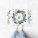 Bienvenue à vos invités dans un décor de style rustique personnalisé. modèle design élégant Ce modèle design élégant présente une couronne de laurier peinte à la main dans une verdure aquarelle sur un arrière - plan en bois patiné blanc et gris. Au centre de la couronne se trouve votre initiale à personnaliser et sous un nom de famille.