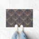 Ce paillasson a un design art déco de diamants et de triangles en or sur un champ de bleu.