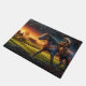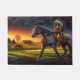 Un Amérindien en robe traditionnelle traverse un champ à cheval peint au coucher du soleil, avec des fermes et d'autres chevaux dans l'arrière - plan.