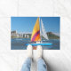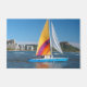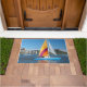 Ce tapis porte un voilier coloré représenté dessus.