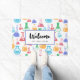 Un tapis de bienvenue avec un motif amusant et coloré. Un scientifique de recherche vibe avec des beakers et des flacons de différentes formes et tailles dans des couleurs vives et joyeuses.
