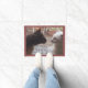 Le design sucré sur ce tapis de porte est une photo originale de deux chats se saluant dans une porte. L'un des chats est un calico, avec une couleur mixte noire, orange et blanche et une pointe d'oreille orange. L'autre chat a une fourrure blanche, des yeux bleus et un nez rose. Par une porte à écran, on peut voir un tapis de bienvenue sur le pont en bois, avec le mot "BIENVENUE" face à l'extérieur de la porte. Un planteur en terre cuite aux verdure et quelques meubles blancs complètent l'arrière - plan.