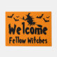 Un mignon tapis d'Halloween avec une sorcière volante, ses chauves-souris familières et volantes qui dit : "Welcome Fellow Witches.