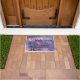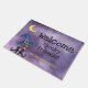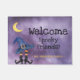 Ce mignon tapis d'Halloween présente des graphismes aquarelle des jambes de sorcière et du casquette. Voici le texte : Bienvenue amis Éffrayants ! Personnalisez le tapis de porte avec votre nom.