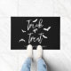 Bienvenue aux hôtes avec l'esprit d'Halloween à l'aide de ce tapis de portes moderne. Le design présente Trick ou Treat dans une typographie en écriture blanche croustillante avec des silhouettes de chauve-souris jouées contre un arrière - plan noir audacieux. Une zone de texte personnalisable sous le design vous permet d'ajouter un nom de famille ou un message d'accueil personnalisé, ce qui en fait une touche unique et festive pour votre entrée pendant la saison éffrayante.