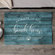Écriture de brosse moderne et chic Lire BIENVENUE À NOTRE MAISON DE PLAGE dans un design branché à la typographie. Superbe décoration de maison de plage personnalisée pour votre maison loin de la maison. A la fois romantique et élégante, notre tapis de porte en bois flotté imprimé turquoise présente une illustration en coquille douce entre votre emplacement et l'année établie.