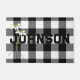 Bouquet de marguerite blanc attaché avec un arc à cordes sur le motif blanc et noir de buffle plaid. Le nom est modifiable.