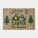 Bienvenue à notre typographie de Camper avec votre nom de famille avec un camper dans les bois. L'arrière - plan est un burlap pour une ambiance rustique.