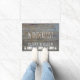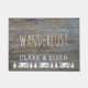 Le cadeau rustique mignon de décor de camping de rv pour des rvers, des couples retirés, et des campeurs personnalisés, natte en bois affligée de regard a lu les profondément satisfaits dans le regard manuscrit, lettres blanches avec un modèle des textes pour ajouter le nom de famille ci-dessous dans les lettres lunatiques. Avec une frontière mignonne et blanche au fond du motorhome vintage RVs et des pins. Sur un fond réel de photo du bois rustique et affligé qui est marqué et vieux. Grand cadeau de retraite de couples, aussi. Soyez droit à la maison devant un rv ou un cabine de rondin confortable.