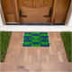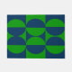 Ce tapis de portes a un design Bauhaus de carrés et cercles en bleu et vert.