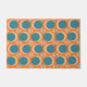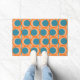 Ce tapis de portes a un design moderne du milieu du siècle de cercles orange ouvert avec des cercles turquoises solides qui traversent le motif avec des lignes verticales turquoises et des lignes horizontales orange.