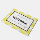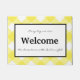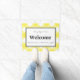 Le mat de porte est affiché en en vichy impression jaune et a un arrière - plan blanc avec bordure et texte noirs. Le texte dit : "Chaque jour nous nous levons", "Bienvenue" en caractères gras au centre et "nous choisissons de servir le Seigneur notre Dieu". Image d'une colombe derrière le mot 'Bienvenue'. Customisez ce tapis ou achetez tel quel.