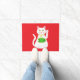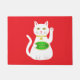 Ce somptueux tapis de portes présente une image graphique d'un chat oriental blanc qui a de la chance. Le chat a de beaux yeux dorés et porte un médaillon d'or sur le collier autour du cou. Le chat a des oreilles roses et des chuchotements. Ce mignon petit chaton tient un jeton doré avec une incrustation de jade verte et un message en texte doré qui dit "Bonne chance".