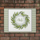 Style classique élégant Verdure Wreath personnalisée avec monogramme et nom. Arrière - plan à rayures vert sage. Un mariage parfait ou un cadeau de ménage. Sage, Crème, palette de couleurs vert foncé.