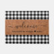 Tapis de bienvenue rustique avec bordure en plastique de buffle noir et blanc et personnalisé avec nom de famille et année établie. REMARQUE : LE COIR N'EST QU'UN EFFET IMPRIMÉ.