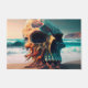 Un grand crâne est posé sur le sable dans l'océan, dans le style de paysages 3D surréalistes, palette de couleurs intenses, redshift, illustrations vibrantes, paysages photo-réalistes, explorations texturales