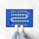 This blue, black and white cribbage board graphic entryway door welcome mat is easy to personalize with the game night host's name, perfect for cribbage players who love this classic card game. Awesome cribbage themed gift for yourself, your cribbage partner, card shark mom, dad, uncle, aunt, brother, sister, neighbor, grandpa, grandma, husband, wife, friend, or work colleague.