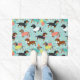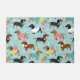 Chiens de fête d'anniversaire mignons avec des manteaux noirs, bronzés et dapple habillés de mignonettes vêtements d'anniversaire avec ballons, gâteau et motif confetti.