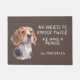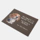 "Pas besoin de frapper deux fois, Nous avons un Beagle" déclare ce mignon tapis de porte. Le texte est en blanc à droite, tandis qu'une adorable photo d'un beagle marron, noir et blanc est à gauche. Tout est posé sur un arrière - plan gris brun.