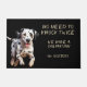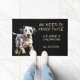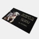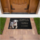 "Pas besoin de frapper deux fois, Nous avons un dalmate" déclare ce tapis de porte amusant. Le texte est en bronze pâle à droite, tandis qu'une photo d'un adorable chien dalmate est à gauche. Tout est placé sur un arrière - plan noir.