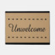 Ce drôle de tapis d'accueil dit en fait le contraire de ce à quoi un visiteur de votre maison pourrait s'attendre. Écrit dans une élégante police cursive en texte noir est le mot Unwelcome, faisant savoir à vos invités que vous préférez qu'ils s'en vont. Ce tapis décoratif pour votre porche ou entrée est une excellente pièce de conversation pour les amis et la famille. Conçu pour les amateurs de sarcasme et d'humour grossier, ce tapis rond fait un cadeau parfait pour le ménage ou cadeau pour les couples mariés. Ce tapis d'entrée serait aussi bien adapté pour un dortoir de collège ou une grande maison.