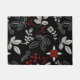 Elegant botanical pattern on black background featuring white leaves, red berries, and intricate floral designs in gold accents, creating a festive, decorative feel.