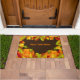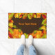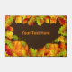 L'arrière - plan marron affiché peut être changé à n'importe quelle couleur de votre choix, en plus du style de texte, de la taille et de la couleur peuvent également être changés pour convenir. Les feuilles d'automne brillantes et colorées sont accentuées par deux citrouilles. Personnalisez avec votre nom ou n'importe quel texte que vous voudriez.