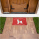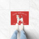 Paillasson de Noël adorable avec un fils Haired Fox Terrier Dog portant un chapeau santa sur un arrière - plan rouge festif.