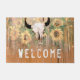 Tournesol rustique western rodeo bull cow crâne avec cornes floral pays texture imprimer intérieur extérieur mat de bienvenue. Bois de grange teintes vintages jaune vert brun. Conception personnalisée de style cowgirl de ferme. Copyright de l'image Marg Seregelyi Photography.