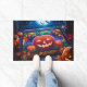 Un mat noir avec un gros jack-o-lanterne et des feuilles d'automne. Le matelas est décoré d'un message Happy Halloween. Bienvenue à vos proches dans le style avec ce - Amuse Colorful Happy Halloween message. Concevez Vos Pieds Avant D'Entrer Dans Le Tapis De Porte.